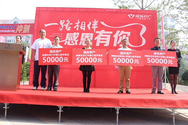 多年來建發(fā)房產(chǎn)一直把慈善事當成當成一項重要的工作,“建發(fā)房產(chǎn)慈善基金”在助學、助困、助孤上都在傳播著“有愛就有路”的理念。在企業(yè)做大做強的同時,積極回饋社會,投身公益的使命和行動沒有止步,繼去年向永安六中捐贈20萬助學金,今年建發(fā)房產(chǎn)三明事業(yè)部將繼續(xù)向永安六中、永安三中、永安實驗小學、永安巴溪灣小學四所學??傤~捐贈助學金20萬,活動當天分別向四所學校代表人,舉行了捐贈儀式?,F(xiàn)場許多來賓及業(yè)主也為建發(fā)房產(chǎn)的善舉表示肯定和贊賞。正如永安六中校長許有濤先生說:“建發(fā)房產(chǎn)的善舉,也許對企業(yè)來講是一個很小的行為,但是對于那些需要幫助人們卻是一件很大事。也許正是這么一個小小的善舉,改變一個人、一生的命運”。