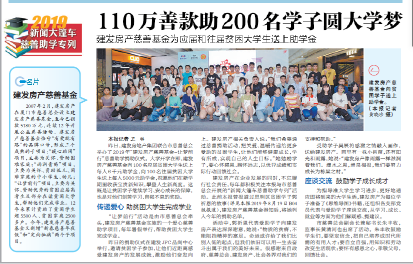 本次捐助活動得到了廈門日報(bào)社的關(guān)注, 2019年8月27日A12版報(bào)道了本次活動。