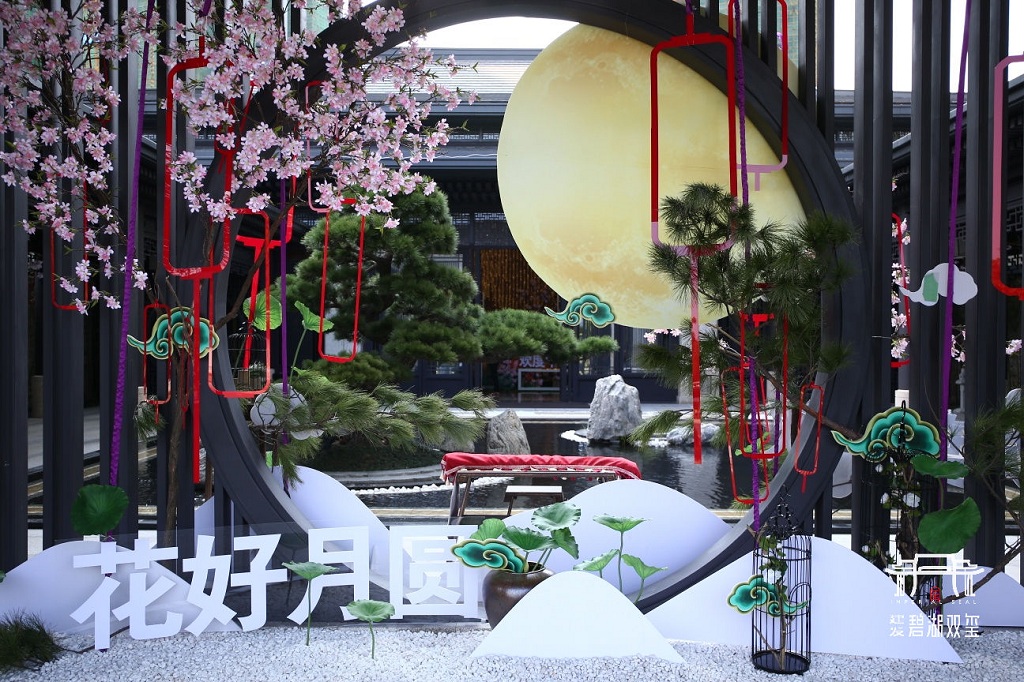 古樸雅致的“花好月圓”入口堆陳、琳瑯滿目的連廊花燈,陳陳箏音在古香古色的碧湖雙璽售樓部悠揚回蕩,余音繚繞,仿佛置身古時的賞燈花節(jié)。靈動仙氣的嫦娥使者在門口歡快地迎接每一位嘉賓。新中式古典奢雅的復(fù)古美陳,玉盤珍饈和精致花藝的唯美搭配,從細(xì)節(jié)處重現(xiàn)極致的東方神韻,一場奇幻美妙的東方穿越之旅從此開啟。