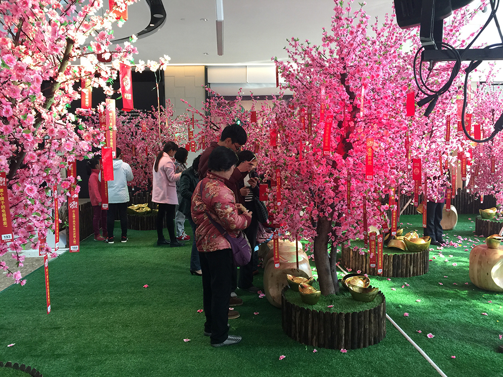 當(dāng)天下午三點(diǎn),JFC品尚中心A館中庭熱鬧非凡,桃花林內(nèi)猜燈謎的人絡(luò)繹不絕,QQ表情符號猜成語、傳統(tǒng)謎語、網(wǎng)絡(luò)腦筋急轉(zhuǎn)彎等各種題目分別懸掛在桃花樹上,猜中的顧客均獲得由JFC品尚中心提供的小猴子手機(jī)掛件。