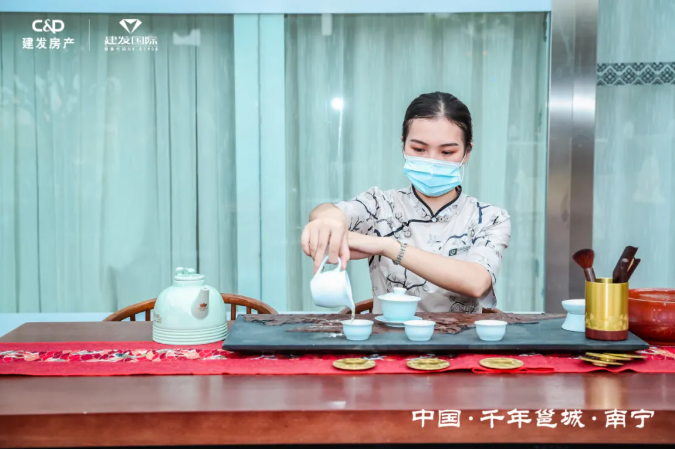 活動(dòng)尚未開始,建發(fā)房產(chǎn)便以一場(chǎng)優(yōu)雅的茶藝品鑒,為來賓們演繹了一場(chǎng)東方美學(xué)大賞。五道大師茶禮,精選天南地北名茶精粹,汲取天地造化精髓,由非遺大師全程監(jiān)制,這五道茶代表著建發(fā)房產(chǎn)在南寧匠造的五個(gè)項(xiàng)目,寄寓著建發(fā)房產(chǎn)對(duì)千年邕城的美好祝愿與獻(xiàn)禮。